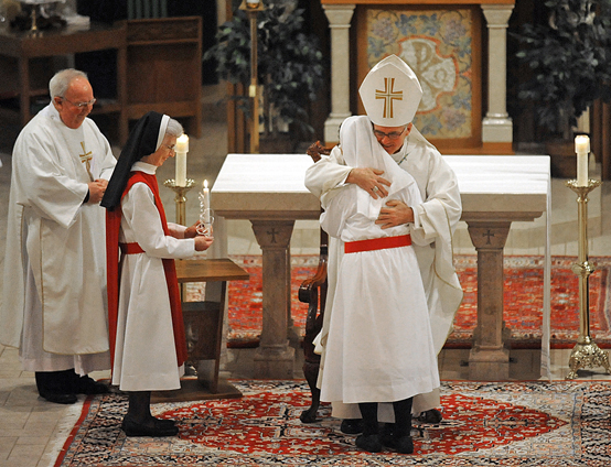 November 27, 2013 By Mary Lou Kilian Watertown – The Sisters Adorers of the Precious Blood, their friends and family gathered for a celebration of the past and the future Nov. 17 at St. Patrick’s Church. Bishop Terry R. LaValley presided at a jubilee Mass marking the 50th anniversary of the arrival of the order in the Diocese of Ogdensburg. During the liturgy, he led a Ceremony of the Reception of the Habit for a new novice in the community. In his homily, Bishop LaValley outlined some of the history of the Precious Blood Sisters in Watertown. “Back in 1963, Msgr. Robert McCarthy made an inquiry with the Mother Superior of the Precious Blood Monastery in Manchester, New Hampshire, urging that a foundation of the Sisters Adorers of the Precious Blood be established in the Diocese of Ogdensburg,” the bishop said. “He purchased a home, here in Watertown, and had it completely refurbished to house the incoming cloistered community. That’s the beginning of a faith story that has enriched the Church profoundly,” he said. Witness of cloistered life “I’m sure that all those who enter through the doors of your monastery today experience the same serenity and joy that I do, each and every time, I am so graciously welcomed into your home,” he said. “As your Constitution reminds you, your love for Mary Immaculate is an integral part of your vocation as Sisters Adorers of the Precious Blood,” Bishop LaValley continued. “Mary Immaculate, Mother of the Church, embraced God’s will heartily and devoted herself to the Person and work of her Divine Son, thereby serving the mystery of Redemption. “It is from Mary’s Immaculate Conception that the Blood of Jesus begins its saving course, and flowing through the Sacraments, brings light and salvation to all the People of God,” he said. “The Most Precious Blood that was shed to set us free pours outward onto every Catholic altar and runs through our veins for the salvation of the world. “The principal mission of the Sisters Adorers the Precious Blood is to give glory to the Father, through the worship of His Son in the mystery of His precious Blood, and to honor Mary, immaculate in her conception,” the bishop said. So, from the lips of Mary and the pen of St. Luke, we join in that prayer of Magnificence: ‘My soul proclaims the greatness of the Lord,’” he said. Reception of the habit. “Sister, what a precious gift you are to the Church,” he said. “We congratulate you as you join this very special community whom we treasure.” During the reception ceremony, Sister Mary asked to be received as a member of the community and promised to observe the Constitution of the Sisters Adorers of the Precious Blood. Bishop LaValley blessed the habit, the cincture and the veil before Sister Mary left the sanctuary to change her clothes. She returned to receive a lighted candle and a new name – Sister Mary Catherine. Sister Mary Catherine joins another novice in the community, Sister Linh Terese Nguyen. The other Precious Blood Sisters at the Watertown monastery are Sisters Marilyn McGillan, Martha Emery, Rosemary Rossi and Elizabeth Washburn.
