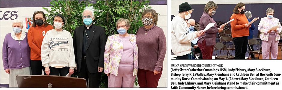 OGDENSBURG – “You are using the gifts that the Lord has given you to be Christ’s hands because your heart beats with His love.” Bishop Terry R. LaValley expressed the importance of Faith Community Nurses in parishes at a commissioning ceremony for four nurses on Saturday, May 1 at St. Marguerite D’Youville Academy in Ogdensburg. The ceremony marked the completion of a Faith Community Nurses Course offered during the month of April to registered nurses and other health care providers by Mercy Care for the Adirondacks. Several topics are covered during the course, including the history and philosophy of parish nursing, advocacy, care coordination, and transitional care, and health, healing and whole-person health which is the idea the parish nurse program is built upon. “They use their scientific and health knowledge with their deep faith and it’s the spiritual healing that goes with the medical healing,” said Donna Beal, executive director at Mercy Care for the Adirondacks. Once commissioned, faith community nurses, or parish nurses, promote health and healing to parishioners through health education and health counseling; assist in the understanding of treatment; connect others to community resources; as well as pray and share their faith. Examples of Jesus healing those who are hurting can be found throughout Scripture, and examples were used as readings during the commissioning ceremony. “When Jesus saw her, he called her to him and said, ‘Woman, you are free of your infirmity.’ He laid his hand on her and immediately she stood up straight and began thanking God.” The nurses then stood and voiced their commitment to their health ministry before program director, Sister Catherine Cummings, a Sister of Mercy, who commissioned them as Faith Community Nurses. One by one, each nurse lit a candle and was presented with a pin and certificate. Judy Elsbury will be a Faith Community Nurse for Church of the Holy Family in Watertown. She is excited to bring her extensive health care experience to her community and join the two other community nurses at the parish. Elsbury said she has several ideas for her parish, one would be to start rosary walks which combine movement and prayer. She would also like to explore different ways to assist parishioners with grieving. “It helps to have people of faith who understand. Miscarriages, loss of a spouse, loss of a pet… people have different loses for different things,” she adds. The three other nurses who took part in Saturday’s ceremony were Cathleen Bell of Our Lady of Grace Parish in Morristown, Mary Blackburn of St. Mary’s Cathedral in Ogdensburg, and Mary Kleinhans of The Catholic Community of Alexandria Bay. Two nurses will be commissioned upon completion of the course: Jennifer Lucia of The Catholic Community of Alexandria Bay and Linda Scagel of St. Raphael’s Parish in Heuvelton. Bishop LaValley closed his remarks by offering his immense gratitude for the selflessness by the parish nurses to this health ministry. “Thank you for your sacrifice of love,” he said. “Thank you for allowing others to see the Christ within you. Thank you for making yourself vulnerable so that none of the vulnerable among us feels forgotten or unnoticed.” For more information on when the next Faith Community Nurse Course will be offered, contact Sister Catherine Cummings, RSM at ccummings@adkmercy.org.