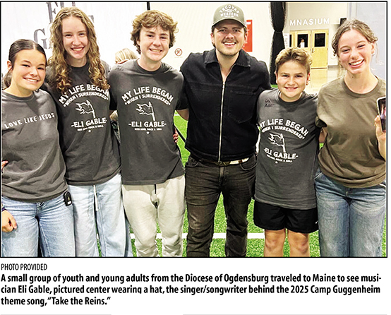 Local group sees singer, songwriter Eli Gable in concert November 26, 2025 By Erin Savarie Each year at Camp Guggenheim, the staff come together to pick a theme song that the campers learn and sing each week throughout the summer. The theme song for Camp Guggenheim this past year was chosen as “Take The Reins” by rising Christian artist Eli Gable. The song focuses on the importance of surrender and trusting in God. Following the closure of the camp season, Gable found a video via the Diocese of Ogdensburg youth Instagram from Camp Guggenheim of the campers and staff belting out his song together. He then remixed the video with a response, speaking about how meaningful it was to him and how it encouraged him as a Christian artist. “That’s what it’s about,” explained Gable. “It’s the fact that God is using this music to connect people to Himself, and to help them feel seen. On my better days, I’m able to understand that the Creator of the universe, the One who existed for an eternity before time began, has better ideas and higher goals than I do for myself. On my lesser days, I need a video like that one to remind me what it’s all about.” Around a month later, a small group of enthusiastic campers, along with a dedicated staff member from the previous camp season organized a special trip to Portland, Maine, to see Gable in concert. “I was really excited to get to see Rend Collective and Eli Gable,” said Katie Samperi, a counselor from the 2025 camp season. “It was a really great experience. I went to see Eli Gable open but loved the Rend Collection portion, too. The first song of the night, Eli Gable started to play ‘Take the Reins.’ He opened the concert with that song. The whole night was a beautiful night of worship, and it started off with ‘Take the Reins.’ It was as if he was letting God take control of the concert and all the worship happening there. It was a good way to dedicate the night to God.” Samperi said the version performed was slightly different than the one regularly played at camp. “I always s love hearing songs live,” she said. “It adds a level of emotion and depth. The version of the song he performed was different from what we listened to all summer. I loved it!” After the show, the campers and staff had the opportunity to attend a meet-and-greet session with Gable. As a token of appreciation, the group presented Gable with several unique pieces of camp merchandise from the camp’s store – including t-shirts, hats, stickers, and even a small poster of the image of Jesus affiliated with camp, known as “Guggy Jesus” – each representing a piece of the camp’s identity. Gable seemed genuinely touched by the gifts and camp stories, taking time to pose for photos. The meeting left a lasting impression on both the campers and Gable, further strengthening the special bond formed through faith, music and community. “So many people were there to worship,” Samperi concluded. “It was awesome.” |