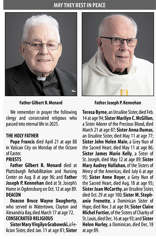 January 14, 2026 The following is the North Country Catholic’s annual look back at the news highlights of the previous year. It was omitted from last edition due to space constraints. • Jan. 3 – The Vocations Committee for St. Mary’s Cathedral Parish in Ogdensburg, St. Raphael’s in Heuvelton and Saints Philip and James in Lisbon holds their first trivia night to raise funds to help support diocesan seminarians. The event has become an annual event, and the second trivia night was to be held Jan. 5, 2026. • Jan. 15 – Knights of Columbus Monsignor Morris L. Dwyer Council #255 in Plattsburgh announces that they had reached a donation milestone at their annual grant award dinner. The Knights donated over $1 million to local charitable organizations since 2007. • Jan 29 – Bishop Terry R. LaValley announces that the generous support of more than 6,200 households enabled the Bishop’s Fund Appeal to surpass its goal of $1.3 million. • Jan. 27 – Catholic Schools around the diocese mark the start of Catholic Schools Week. • January – Father Scott R. Seymour is appointed executive director of Catholic Charities. The organization says it continues to build on its 106 years of service. • Feb. 12 – At the Education Council of Immaculate Heart Central in Watertown, the school’s Board of Governors appoints Amy Mitchell as the school’s new principal effective July 1. • Feb. 13 – Sister Mary Camillus O’Keefe, a Sister of Mercy of the Americas, celebrates her 100th birthday shortly before the sisters in the Lake Placid convent relocated to a Sisters of Mercy home in Westchester. • March 5 – Pilgrimage Passports highlighting Jubilee Year of Hope pilgrimage locations around the diocese, are released. Copies are distributed in the pilgrimage churches and in the North Country Catholic. • March 9 – Catechumens and candidates from around the diocese gather with Bishop Terry R. LaValley at St. Mary’s Cathedral for the annual Rite of Election and Call to Conversion. • March 19 – Bishop Terry R. LaValley announces the approval of plans for 21 pastoral care areas as part of the 2025-30 Living Stones planning process. • March 22 – A women’s discernment event, “Let Go, Let God,” a joint project of the diocesan Vocations Office and Campus Ministry, is held at St. Mary’s Church in Canton. • March 26 – Bishop Terry R. LaValley announces the retirement of Sister Mary Eamon Lyng, diocesan Vocations coordinator, and Sister Bernadette Marie Collins, episcopal delegate for Religious. Both Sisters of St. Joseph, their retirements became effective July 1. Bishop LaValley appoints Deacon Garry Stevens to fill both roles. • April – Augustinian Academy reaches its goal of collecting 1,000 pounds of plastics, products that typically can’t be recycled, to be recycled into composite decking and manufacturing materials. For its efforts, the school receives both a bench made of the recycled materials and recognition in the Green Apple Awards, a project of the Diocese of Ogdensburg Laudato Si Committee and the Diocese of Syracuse Education Office. • April 10 – Bishop Terry R. LaValley is joined by priests from around the diocese at St. Mary’s Cathedral to celebrate the annual Chrism Mass. • April 18 – The Immaculate Heart Central Mystery Players conclude their 45th season on Good Friday with their prayer in performance at St. Patrick’s Church in Watertown. • April 23 – Bishop Terry R. LaValley celebrates Mass for the deceased pope. • April 26 – Highway to Heaven, a Jubilee Year of Hope event focused on the Eucharist, is held at St. Agnes Church and School in Lake Placid. • May 7 – The conclave to select a new pope begins. • May 8 – On May 8, Cardinal Robert Francis Prevost is elected Pope Leo XIV by the College of Cardinals as the 266th successor of St. Peter, making him the 267th pope and the first from the United States. • May 20 – Bishop Terry R. LaValley celebrates the annual Jubilee Mass, part of the Presbyteral Assembly held in Lake Placid. Honored jubilarians – priests celebrating milestone anniversaries – include Father John L. “Jack” Downs and Father Gilbert B. Menard, 70 years; Father L. William Gordon, 60 years; Father Lawrence Marullo, 50 years; Father Guy F. “Bill” Edwards, Father Michael I. Miller, a Missionary of the Sacred Heart, and Father Raymond J. Moreau, 40 years; and Father Theodore A. Crosby, Father Joseph W. Giroux, and Father Michael H. Marzan, 25 years. • May 22 – Dr. Michael Szostak, a concert organist from Warsaw, Poland, performs at St. Mary’s Cathedral in Ogdensburg, a Jubilee Year of Hope event. • May 22 – An Indigenous Human Trafficking Listening Session in Akwesasne draws participation from Patrick Dussault, Herbie Herne, Felicitas Frugo Onetti, Amie Barnes, Joyce Muchan, Dr. RJ “Dolly” McDonald, Father Jerome Pastores, Chief Lisa Francis Benedict, Lisa Zeran, Chief Cindy Francis Mitchell, Hattie Taylor, Father Scott Seymour, Diane Noiseux, Bishop Terry R. La Valley, William La Page, Shelly Jacobs, Susan Griskonis, Matt Rourke, Father Michael Carson, Colin McNamara, Hawi Thompson, John Bay, Sister Mary Ellen Brett, SSJ, and Julia Kaplan Toce. • May 24 – Bishop Terry R. LaValley ordains three deacons, Deacon Michelet Boncoeur, Deacon Dennis Ombongi and Deacon Tyler Fitzgerald, at Sacred Heart Church in Massena. The three men are seminarians for the diocese and are scheduled, God willing, to be ordained to the priesthood in 2026. • May 28 – Bishop Terry R. LaValley announces 14 priest assignment changes, including three retirements. Father Douglas A. Decker, Father Robert L. Decker and Father Donald A. Robinson. Father Sony G. Pulickal became pastor of the Catholic Community of St. Peter and St. Mary and St. Hedwig in Lowville; Father James V. Teti became pastor of St. James Major Church in Lake Pleasant and St. Ann’s Church in Wells; Father Albert J. Hauser, bec