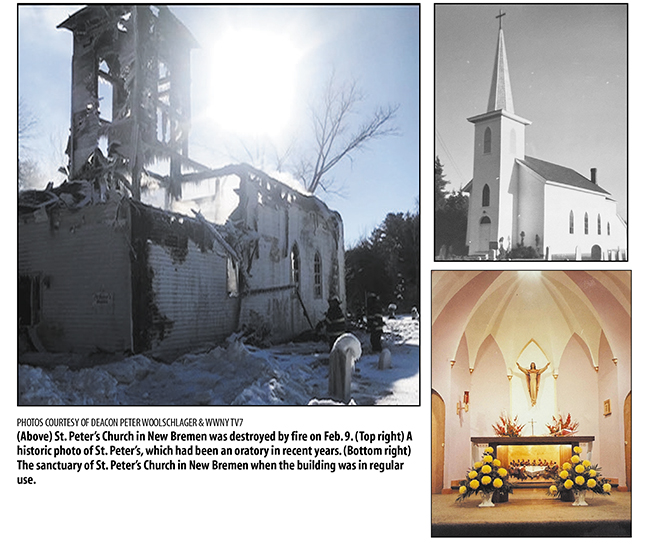 February 25, 2026 By Deacon Kevin Mastellon St. Peter’s Church in New Bremen is surrounded by graves. The parish church started burying former parishioners on the grounds soon after the Church was built in 1852. The parish was incorporated in 1869 to serve Catholics between Croghan and Lowville in Lewis County. The Church was located on Tilman Road. The nearest community is called New Bremen. It was originally known as Dayansville. Construction of St. Peter’s was finished in 1892 with the addition of a steeple. By the time Monsignor Joseph Conroy became the third Bishop of Ogdensburg. St. Peter’s was listed as a mission of the parish in Croghan. The Church is an oratory now. There was an occasional funeral Mass celebrated there. Annually in June the parishioners of St. Peter’s would join the pastor and parishioners of St. Stephen’s in Croghan to celebrate a patronal Mass at the Church dedicated to St. Peter. Until February 9, 2026. “It was two or three o’clock in the morning when someone drove by and noticed the flames coming out of the Church,” according to Father Donald Manfred, the pastor of St. Stephen’s in Croghan, the parish that includes St. Peter’s in New Bremen. The Church building was destroyed by that fire. St. Peter’s was one of the earliest constructed in what would become the Diocese of Ogdensburg. A statue of St. Peter that stood at the front of the Church was salvaged. So were a holy water font and the Church bell. “The firemen were very good about saving whatever they could,” Father Manfred said. Since the church was an oratory, the Tabernacle was empty. Hand-carved wooden statues of Mary and Joseph were lost. No cause of the fire has been determined. “We have had a number of agencies investigating from Lewis and Jefferson Counties. The New York State Department of Environmental Conservation has been on site too,” Father Manfred said. “But they do not have a cause yet.” “There was an oil tank in the basement of the building, and it had leaked. Just how much leaked out is still to be determined,” according to the pastor. “The tank has been removed, and the grounds will have to be dealt with before any additional work at the site.” The North Country Catholic asked if the fire might have been set intentionally. Father Manfred told us, “I don’t think there is anything right now to even guess what might have happened.” Reconstruction of the Church is not even a consideration according to Father Manfred. Consideration will be given to a memorial on the site, and an annual service to recall all the people who, over the years, called St. Peter’s home. Deacon Peter Woolschlager grew up about a quarter mile down the road from the church. He celebrated his sacraments of initiation in St. Peter’s. The deacon is now a well-known musician and music teacher. “I started there as an altar server but then, as I tell people, I was benched, the organ bench,” he said. “I played the organ at Mass and other liturgies until I was asked to move to St. Stephen’s when I was in high school.” Deacon Woolschlager was ordained in 2021. He is now assigned to St. Stephen’s in Croghan and St. Francis Solanus in Harrisville. One of the pictures that circulated after the fire was of the statue of St. Peter that survived the fire. The statue is in the foreground of the picture with the charred remains of the church in the rest of the scene. St. Peter is holding the keys to the kingdom in his hand, reminding us, Deacon Peter said, “of what is most important.” Father Manfred said it best, “It has been a devastating experience for people in the area. There are so many that remember family occasions, baptisms, confirmations, weddings, funerals and so many people that remember their place of worship. It is not so much a loss of a building as a loss of a place that reminds people of their faith, the beginnings of their faith. That is the sad part of this whole thing.” |