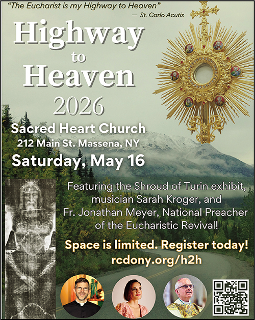 February 25, 2026 By Mary Beth Bracy A replica of the original Shroud of Turin is coming to the Highway to Heaven 2026 event on May 16 at Sacred Heart Church in Massena. Dave and Cathy Witkowski and Leslie Marvel, all of Plattsburgh, will drive to the National Shrine of St. Maximilian Kolbe in Marytown to pick up the life-size canvas replica and exhibit. It will be transported in a 14-foot-by-11-foot 3-inch trailer weighing 2,360 lbs. “We are honored to be asked to assist in ensuring the safe transfer of the replica of the Shroud of Turin from Chicago to the Sacred Heart in Massena for the Highway to Heaven event,” noted Dave Witkowski, a member of Monsignor Morris L. Dwyer Knights of Columbus Council #255, and Cathy Witkowski, chair of the Board of the Eastern Region Commissioned Lay Ministers. “What an awesome way to help with evangelization in our diocese by playing a small role in ensuring the display of the beautiful exhibit.” Marvel, Holy Cross Parish office manager, agreed. “What an honor to pick up the replica of the Shroud of Turin and bring it to Massena for so many Catholics to experience,” she said. “The thought of seeing the replica, the burial cloth of Jesus’ Passion is mind boggling. It touches my soul so deeply.” Amy Schirmer, a founding member of the Highway to Heaven organizing committee from Ogdensburg, reflected on the significance of this exhibit. “Something that is difficult with Eucharistic Events is finding an ecumenical, even evangelistic component,” she said. “How do we draw people to an interest in the Eucharist, when partaking may not be a possibility for them? Certainly, this would be an issue for our Protestant brothers and sisters. They love Our Lord dearly, but do not believe Him to be present in the most Blessed Sacrament. The Shroud of Turin is a wonderful answer. Recent interviews and YouTube videos have made the Shroud a point of interest or curiosity to anyone with a computer! Having a life-sized replica along with professional signage and ‘explainers’ will be a draw for even those with no faith background.” However, this is much more than an opportunity to see an exhibit, added Schirmer. “As people are viewing the replica and reading the story of Christ’s Passion, Catholics will be praying before the Blessed Sacrament, as well as hearing teaching from a gifted and holy priest (Father Jonathan Meyer),” she said. “The impulse of curiosity being upheld with the power of prayer and deepening faith … this is like dynamite. So powerful we cannot begin to imagine the far-reaching nature of this ‘explosion.’” Indeed, the power of the Shroud’s mystery continues to touch the hearts of the faithful and those in the scientific world. Dr. Gilbert Lavoie, who conducted his own experiments and research, authored the book “The Shroud of Jesus.” He wrote of its impact, “God is at work, visually communicating to us through his Son’s shroud and his Son’s image – his Son’s hour of glory: the crucifixion, resurrection, and ascension of his Son moving upward toward his Father. Yes, what you see is what you get. Set before us, in a captured moment in time, is the occurrence of the final dynamic event of the whole story of salvation, our salvation.” Deacon Tom Gaida, who coordinates visitations of the Shroud replica, shared, “The exhibit was originally created by the Center of the Passion of Christ of the Holy Shroud many years ago, before I came to Marytown. We updated it in 2021. The exhibit presents the latest, most up-to-date scientific information available concerning the origin of the shroud and its age. Also, the life size corpus of Jesus on the cross is a very detailed, powerful, and accurate depiction of the wounds Christ suffered according to the information revealed by the Shroud.” Deacon Gaida said science has confirmed the original shroud is not of human origin. “The information contained in the shroud from strictly a scientific point of view basically rules out that the image on the Shroud was produced by human effort,” he said. “Ultimately this is a journey of faith. There will always be skeptics. But the exhibit presents a very convincing argument for the authenticity of the Shroud of Turin and Christ’s Resurrection.” This isn’t just about looking back at history; it points us to the Real Presence of Jesus: The Eucharistic Face of our Savior with us now. “Along with the Shroud Exhibit, there will be an encore presentation of the Eucharistic Miracles that St. Carlo Acutis catalogued before his death,” Schirmer said. “How often do ‘BEFORE’ and ‘AFTER’ pictures draw the same expressions of amazement and awe?” “One other thing: If we do have the general public coming out of curiosity, then faithful Catholics need to be ready with joyful answers as to the faith we hold so dearly,” emphasized Schirmer. “It’s never too early to be ready to give an accounting!” It’s all about a personal relationship with our Lord, said Schirmer. “The Shroud tells us how much He loved us,” she said. “The Miracles tell us how much He continues to love us. The Eucharist is truly our Highway to Heaven. Let us bring as many as we possibly can on this journey!” For more information, visit https://www.rcdony.org/h2h |