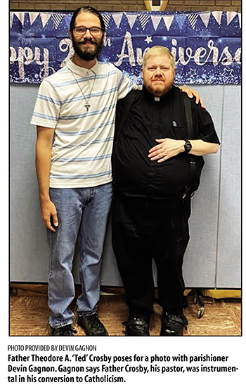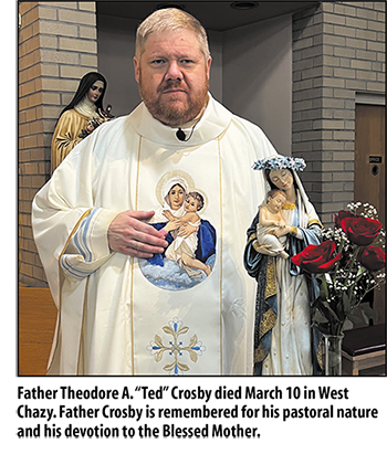March 18, 2026 By Darcy Fargo “From the moment I met him, (Father Theodore A. ‘Ted’ Crosby) would talk to me like he had known me my entire life,” said Devin Gagnon, a parishioner of St. Joseph’s Church in West Chazy, where Father Crosby served as pastor. “Father Ted cared so much about the well-being of me and everyone else he spoke to and would take the time to give amazing advice like a true spiritual father when I needed it. Father Ted was always a joy to be around, and I would always walk away from speaking to him feeling uplifted and cared for.” Father Crosby died unexpectedly March 10 in West Chazy. He was 55. His obituary is included below. Gagnon noted that Father Crosby was instrumental in his conversion to Catholicism. “In April 2024 I went to Saint Joseph’s Church in West Chazy for the first time, and after Mass I had the privilege of meeting Father Ted,” Gagnon said. “He was so welcoming and thrilled that I was interested in Catholicism. Father Ted had mentioned numerous topics including the seven sacraments, the early Church fathers, their writings, and the importance of the Eucharist. This information given by Father Ted put a fire in my heart to learn more about the Catholic faith and Church history. A year later, I was baptized during the Easter Vigil of 2025 by the grace of God. Father Ted has left a major impact on my spiritual journey, and I could never thank him enough.” Gagnon said Father Crosby combined love, humor and a breadth of knowledge of the faith to bring others closer to the Lord. “Father Ted would make a room light up with how kind and loving he was,” Gagnon said. “Father Ted also had a sense of humor like no other. He would always manage to slip in a well-crafted joke in a homily that would get the crowd laughing. This combined with his wisdom and deep understanding of the Catholic faith made him such a versatile person to be around. One minute you’re learning about the history of the church, the next minute you’re cracking up. He truly was a gift to our town and diocese.” Father Scott R. Seymour, pastor of St. André Bessette Parish in Malone and a classmate of Father Crosby’s at Wadhams Hall and Christ the King seminaries, described Father Crosby’s preaching style as “reminiscent of Archbishop Fulton Sheen.” “He never had anything in front of him,” Father Seymour recalled. “His gestures and mannerisms were very much like Fulton Sheen’s, and he had a great sense of humor and could make things come alive. I called it preaching/teaching. He’d give a beautiful message, but it would also be a teaching moment.” Father Seymour said Father Crosby was a good friend despite his reserved nature. “He tended to be a little shy with those he didn’t know,” added Father Seymour. “Once he knew you, though, he was the life of the party. He had a sense of humor that could knock you over! He would keep us laughing all the time, but you had to get him to that moment. “Even if you didn’t see him or hear from him for weeks or months, when you reconnected with (Father Crosby), you just picked up where you left off. He loved to reminisce about the days in seminary and all the trips we went on. He didn’t like crowds, though. It just wasn’t him. He came to my 25th anniversary celebration, but he came only to the Mass. He skipped the reception. That just wasn’t him. But he never lost touch. He was a good friend. No matter when you needed him, he would always be there.” Father Crosby was known for his love of the Blessed Mother. “He referred to the Blessed Mother as ‘mama Mary,’” Father Seymour said. “He would remind us that mom will never leave you alone, and mom will never let you down. Her son, Jesus, gave her to us.” “If someone on this earth had a devotion to The Blessed Virgin Mary, it was Father Ted,” Gagnon agreed. “He always would join our prayers to Hers, and before every Mass, you could count on him taking a gaze at the statue of Our Lady. He would frequently ask us to pray a rosary every day and to strengthen our devotion to Jesus’ Blessed Mother. He has said the quote many times ‘It is through Mary that Jesus came to us, and it is through Mary we are led to Jesus, Mary always leads us to her son.’” While his love of Mary was always evident, he had a couple other loves, Father Seymour noted. “If you walked into his house, you could generally know three things he was passionate about,” the priest said. “One was clearly the Blessed Virgin Mary. She was everywhere – statues, rosaries, pictures. He just loved her. His second passion was the Civil War and that era. He had lots of representations of Mary, but he also had a larger-than-life portrait of Abraham Lincoln. When he went on vacations, he often spent them on the battlefields in Pennsylvania and elsewhere. His third love was the music of Hank Williams – senior not junior. That was his taste. “He also had a great love of animals, especially his dog, Molly.” Father Crosby was also known for his care for the dead. “Father Ted also was an advocate for the poor souls in purgatory,” Gagnon said. “He truly had a grasp on the importance of prayers for them and would frequently give penances asking to pray Hail Marys for their poor souls.” Gagnon said the beloved priest encouraged the faithful to embrace signs of their faith. “Father Ted on numerous occasions told his congregation, ‘Every Catholic home should have a crucifix in it, even every room if you can. It reminds us what God has done for us, because He loves us,’” Gagnon recalled. Father Seymour said his friend and classmate loved being a priest. “(Father Crosby) loved his ministry. He loved Church work,” Father Seymour said. “He loved offering the gift of God’s forgiveness and mercy and helping people find new hope in their lives.” Gagnon indicated he had found such hope. “Although we mourn the passing of Father Ted who touche