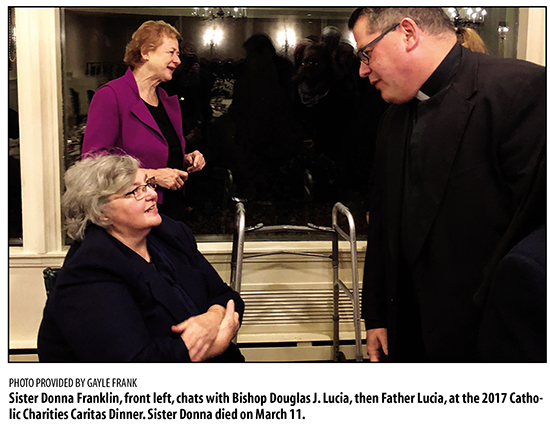 March 18, 2026 By Darcy Fargo While she helped thousands of people in her 22-year tenure as director of Catholic Charities of the Diocese of Ogdensburg, Sister Donna Franklin, a Daughter of Charity, focused on each individual as a beloved child of God. Sister Donna died early in the day on Wednesday, March 11. “Looking back at her time at Catholic Charities, it was under her leadership that they started outreach to migrant farmers,” said Gayle Frank, retired diocesan Family Life director and Youth director, who worked with Sister Donna regularly for two decades. “To my knowledge, she was the first one who started working on human trafficking awareness in the North Country. Wherever there were marginalized people, she was there. During the Ice Storm (of 1998), (Sister Donna) traveled all over the diocese with Bishop Loverde going to farms and going to businesses and making sure each person had everything he or she needed. That was lifegiving for her. It really got her out into the trenches.” Sister Donna earned a bachelor’s degree in 1981 from Emmanuel College in Boston; a master’s in social work in 1988 from the Hunter College School of Social Work in New York; and a certificate in chemical dependency counseling in 1991 from Villanova University in Pennsylvania. She was licensed clinical social worker in New York State, and she used those skills regularly in her role at Catholic Charities and in the service of others. “Between youth ministry and family life ministry, it wasn’t uncommon to run into families experiencing problems – family conflict, divorce, separations and other problems,” Frank said. “If there was a problem I didn’t know how to handle, I could always go to (Sister Donna). I would regularly go to her for advice. She had all the degrees I didn’t have. I just had the sense to get qualified help. We were able to talk through a lot of the issues we’d see. And while she was always serious about her ministry, she also did it all with laughter and love.” Frank said Sister Donna strongly believed in supporting the “domestic Church.” “Her whole vision was to put family first and God will provide a way,” Frank said. “She would very, very kindly and passionately spread that to everyone she knew. In every incident that came up, to every person who came into the Catholic Charities office, she showed kindness and compassion. She was direct, and she spoke the truth without fear, but she did it with love and care.” In addition to her work with Catholic Charities, Frank noted that Sister Donna was a regular instructor in the Formation for Ministry program and in the Deacon Formation program. “(Sister Donna) worked a lot with the wives of the guys in deacon formation,” Frank said. “She’d tell us, ‘put family first. It’s your husband’s ministry, and you’re in it with him, but the sacrament comes first.’ She was wonderful! She taught us well. She listened to us – all the wives. She would bring in speakers who were real people with real issues. She wanted us all to know we could do this without being perfect first.” Frank said Sister Donna was also a personal friend and helped her deal with her own family situations. “We had lots of issues with our own kids,” Frank said. “Our son was a drug addict. (One son) had two divorces. (Another son) had one divorce. And I was the Family Life director. She was the only person I dared to tell for a while. We often discussed the fact that every family is dysfunctional, even ours. And (Sister Donna) always listened and offered love and wisdom.” Frank and Sister Donna often traveled together as they went to conduct workshops or classes. “It was always an adventure with (Sister Donna),” Frank said. “It really was. We always had a great time and laughed a lot. She was a wonderful woman of God.” Sister Donna was honored upon her retirement with the Cross Pro-Ecclesia et Pontifice (Cross for the Church and the Pontiff.) The award, conferred for distinguished service to the church, is the highest medal that can be awarded to the laity by the pope. In 2011, she was honored with the New York State Catholic Conference Council of Catholic Charities Directors’ annual Bishop Mugavero Award. The award recognizes individuals in New York State who have made significant contributions in charity and social justice. Before she was assigned to the Diocese of Ogdensburg, Sister Donna worked as a parish social worker in Philadelphia, a caseworkersocial work supervisor for Child Day Treatment Center, Bronx; and a director of group homes for children in Albany and in Boston among other social work positions in Philadelphia, New York and Kentucky. A complete obituary was not available at NCC press time and will appear in a future edition.