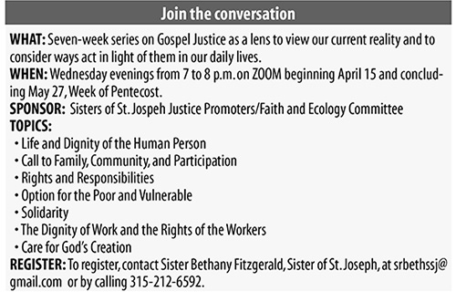 April 15, 2026 Dear Sisters and Brothers in Christ: During this Easter Season, we hear a familiar story from Luke’s Gospel, the story of the disciples’ encounter with Jesus along the road to Emmaus on Easter Sunday, the day of His Resurrection. In that story, Jesus walks with those disciples, and He talks with those disciples, but the disciples don’t recognize the risen Christ. While Jesus walked that road with his disciples thousands of years ago, we’re still walking our own roads to Emmaus today. How often do we fail to recognize Christ as He speaks to us, calling us to love our neighbors, even our difficult neighbors and the neighbors who live, look, behave or believe differently than us? How often do we fail to recognize Christ in others and fail to treat the Christ in others with the dignity He deserves? Starting soon, we’ll have an opportunity to discuss ways we can better serve Christ in others in “Putting on the Lens of Gospel Justice,” a seven-week series focused on Catholic Social Justice teaching offered by the Sisters of St. Joseph and our diocesan Faith and Ecology groups. Those who participate will learn from knowledgeable and faithful instructors about the seven themes of Catholic Social Justice – the life and dignity of the human person; the call to family, community and participation; our rights and responsibilities; the poor and vulnerable; the dignity of work and rights of workers; solidarity; and care for God’s creation. The series begins April 15 and will run Wednesdays through May 27. Each session will run from 7 to 8 p.m. To register, contact Sister Bethany Fitzgerald, a Sister of St. Joseph, at srbethssj@gmail.com or by calling 315-212-6592. Even if you can’t make every session, I encourage you to join the conversation and learn more about how to view the world and your neighbors through the lens of those Catholic Social Justice themes and to act with the love of Christ. Faithfully yours in Christ, |