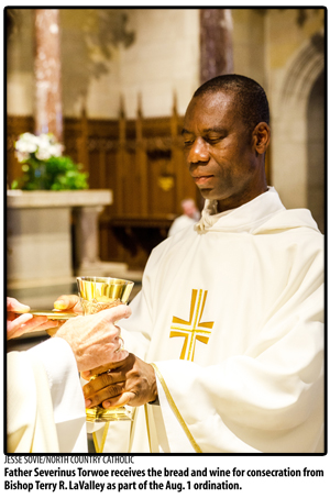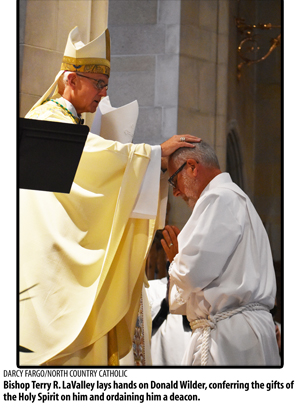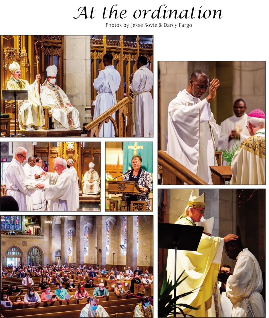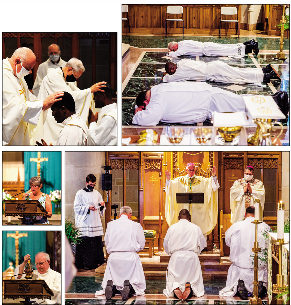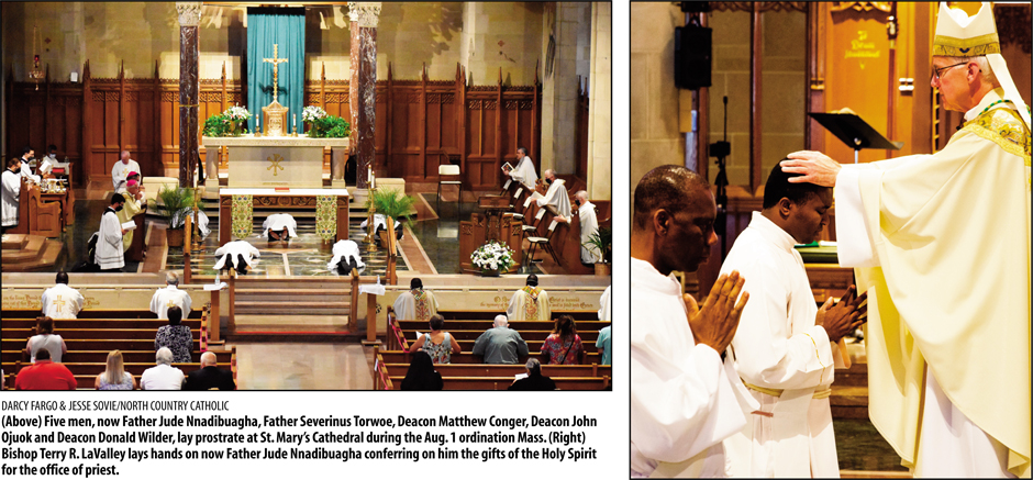 By Darcy Fargo OGDENSBURG – “Go out to all the world and tell the good news: Jesus Christ is risen, and he lives among us. Brothers, your task, the mission with which you are charged this day, is to win people for Christ with apostolic zeal, and to teach, govern and sanctify them in the name of Jesus.” Those were the words of Bishop Terry R. LaValley as he prepared to ordain Jude Nnadibuagha and Severinus Torwoe to the priesthood, and Matthew Conger, John Kennedy Ojouk and Donald Wilder to the diaconate on Aug. 1 in St. Mary’s Cathedral. The cathedral, with two of every three pews blocked off to comply with social distancing requirements, was sparsely filled with mask-wearing priests, deacons and the family and friends of the men who would be ordained. After the Gospel, Deacon Fernando Solomon presented the candidates for the diaconate, and Father Christopher C. Carrara, director of seminarians, requested that the men be ordained. “Most Reverend Father, Holy Mother Church asks you to ordain these men, our brothers, to the responsibility of the diaconate,” Father Carrara said, addressing Bishop LaValley. “Do you know them to be worthy?” Bishop LaValley asked. “After inquiry among the Christian people and upon the recommendation of those responsible, I testify that they have been found worthy,” Father Carrara answered. “Relying n the help of the Lord God and our Savior Jesus Christ, we choose these, our brothers, for the Order of the Diaconate,” Bishop LaValley responded. Deacon Solomon then presented the candidates for priesthood, and Father Carrara used similar language in requesting that they be ordained. “Relying on the help of the Lord God and our Savior Jesus Christ, we choose these, our brothers, for the Order of the Priesthood,” Bishop LaValley responded. In his homily, Bishop LaValley thanked the five men for their willingness to serve God and the Church and thanked their families for supporting their vocations. “Brothers, let me begin by expressing my gratitude to each of you for offering your lives to Jesus Christ in ordained ministry,” he said. “I am particularly grateful to your parents and your wife and your families for their faith witness and support of your vocational discernment. Unfortunately, some of your loved ones can’t be here due to the pandemic. I do hope your family, whether in Ghana, Nigeria, Kenya or stateside are able to participate via livestreaming.” Bishop LaValley also welcomed Bishop Douglas J. Lucia, bishop of Syracuse, to the ordination. Bishop Lucia previously served as director of vocations for the Diocese of Ogdensburg and worked with the men being ordained during their discernment and formation. Bishop LaValley then reminded the assembly about the role of the ordained clergy. “My friends, these men before us now are to be advanced to the Order of Deacons and Order of Priests,” he said. “They are to serve Christ, the teacher, the priest and shepherd, by whose ministry his body, the Church, is continually being built up here on earth into the people od God. These our brothers will be consecrated for the preaching of the Gospel for the sanctification of God’s people and for divine worship. With the help of God, and our prayers and our support, they shall go about all these duties in such a way, in such a way that we will recognize them as true disciples of him who came not to be served, but to serve.” Bishop LaValley reminded the men to be ordained that they are called to use their unique gifts in the service of the Lord. “Jesus chooses his disciples by name,” he said. “And how different we are by temperament and personality. There is no perfect human model. The hearts of each of you here to be ordained beat with the same passionate love for Jesus. Still, you’re very different. Your gifts, your personalities will touch different people in different ways, and it seems that’s the richness, that’s a gift. That’s the attractiveness of ordained ministry. As Paul wrote to the Romans, we all have different gifts. Use them to build up the one Body of Christ.” Bishop LaValley also reminded the men that “fraternal support is crucial.” “You’ve heard mem mention it often: Ours is not a Lone Ranger ministry,” Bishop LaValley said. “When one is ordained, he does not obtain a permit to set up private practice. The priests and deacons of this local church are second to none – Sorry, Bishop (Lucia) – of which I am so very proud. We call each other up. We talk about our struggles. We check on one another. We care. That’s so important. We should never become strangers to each other.” Bishop LaValley also cautioned the men to “beware of the routine of prayer, of Mass, of coworkers.” “You know close associations with people or things can lead to a loss of respect for them,” he said. “Knowing someone or something very well, we can easily become bored with them and stop treating them with respect or stop paying attention to them. We can take them for granted. When we continually encounter the sacred, be it the Mass or any of the sacraments, they risk becoming routine for us, and reverential fear can be extinguished. Conditioned by all our habits, we no longer perceive the great, ever-new and surprising fact that God himself is present, speaks to us, gives himself to us. So, my brothers, celebrate every sacrament as if it were for the first time, the last time, the only time.” Following the homily, the elect for the diaconate and then the priesthood stood before Bishop LaValley and expressed their resolve to carry out their office in accord with the mind of Christ and the Church. The five men then prostrated themselves as a sign of humility for the Litany of Supplication. After the Litany, Bishop LaValley laid hands on Conger, Ojuok and Wilder, and prayed the Prayer of Ordination, conferring the gifts of the Holy Spirit and ordaining the men as deacons. The three men were then veste