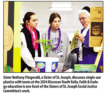 November 5, 2025 By Darcy Fargo “We advocate for Gospel justice and for the care of our dear neighbors and creation.” That’s how Sister Bethany Fitzgerald, a Sister of St. Joseph, described the community’s Sisters of St. Joseph Social Justice Committee and the work that committee has been doing for over 15 years. The committee is one of the many ways the sisters live out their vocations and their community’s charism. “Gospel justice is based on the principles of the six Catholic social justice teachings,” Sister Bethany said. “Of course, Pope Francis added the seventh social justice teaching – care for our common home. It’s all based on and rooted in the Gospels. The challenge to justice has never changed, even though the situations in which we are called to work for that justice have changed over the years.” Sister Bethany said the committee’s work has two major components. “Love has two feet,” she said. “One is expressed in care for the neighbor – direct care, helping in ways like feeding the hungry. The second foot is looking at what’s causing the concerns and the situations that are creating this need and advocating for change. As an example: you’re sitting down by a riverbank or body of water, lounging in your Adirondack chair, and you see there’s something in the water. You get up, and you move closer to the edge of the water, and you look, and it’s a baby! You go down into the water, and you go get the baby. You make sure the baby is ok and dry and safe, and you call 911. That’s the immediate response of love, the direct care – taking care of the baby. Then, you’re looking around, and you realize there are more babies floating down the river. That’s when you say, ‘where are these babies coming from? We need to figure this out and make sure we don’t have more babies floating down the river. That’s the justice question. As Catholics, we’re very good at that immediate response, that direct care. I think we could spend more time asking what structures are creating the need and advocating for change. That’s social justice and advocacy.” How we vote as Catholics is included in that advocacy. “When we look at social justice, it’s not viewed through a political lens,” said Sister Bethany. “We view it through the lens of the Gospel and Gospel justice, based on the seven Catholic social justice teachings. Personally, I support the candidate I think is best living out the Gospel and the call for justice, and I don’t care about their political party. I look at how they respond to the cries of the poor and the cries of the earth – and the two are the same.” Sister Bethany said the Sisters of St. Joseph Social Justice Committee’s areas of focus are determined by the community. “As community, the Sisters of St. Joseph gather every four years and we set the direction based on what we see as needs, the concerns we see as a community,” she said. “That gives direction to the committee, which is made up of sisters, lay associates and others. The committee looks at the broader concerns, and we try to determine what actions we can do.” Human trafficking has been one of the committee’s causes in recent years. “We work a lot on education,” Sister Bethany said. “We’ve been getting people together to learn about trafficking and learn how to prevent it. The hope is that they’ll be inspired by these discussions and create opportunities for similar discussions in their communities.” Faith and ecology also fall under the social justice committee’s umbrella. “We’ve been working on water,” Sister Bethany said. “That’s something the sisters asked us to work on several years ago. And we do a lot of work on single-use plastics. They get into the water, and it affects the water and all the species in the water and drinking the water – so they affect everything. We’ve been working with the schools and religious education programs to collect plastics that are typically not recyclable to make into railings and decking. Last year, Augustinian Academy students collected over 1,000 pounds of plastics, and they’re getting a bench as a result. They’ve already collected 500 pounds more towards another bench.” The Faith and Ecology groups have also been working to promote ecology at schools through the Green Apple Award program, a program that highlights the work being done by students to care for God’s creation. The Sisters of St. Joseph also committed to a Laudato Si Action Plan, a plan to address seven areas within that encyclical of Pope Francis, to be completed within seven years. Ecology and social justice are intertwined, Sister Bethany noted. “Care for creation, racism and immigration are all related,” she said. “That’s something we’ve been working on along with sisters from around the country and the Leadership Conference of Women Religious. Meetings we’ve had at both the state and federal level include talk of the interconnectedness between those things. If you look at human trafficking, for example, refugees and immigrants, many displaced because of the effects of climate change, are among the most vulnerable.” Along with that leadership conference, the local Sisters of St. Joseph, joined by members of the lay associates and faith and ecology committees, participated in Bread for the World’s “Offerings of Letters,” a campaign to write letters to legislative representatives about issues related to hunger. The Sisters of St. Joseph Social Justice Committee has also been working to establish relationships with local state and federal representatives. “We want to have established relationships with them, so we can encourage them to protect individuals and the earth,” said Sister Bethany. “And we want to affirm them when they are doing that.” One of the Sisters of St. Joseph Social Justice Committee’s key jobs, though, is discernment. “Trying to decide what little thin