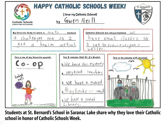 January 28, 2026 St. Bernard’s School in Saranac Lake will celebrate Catholic Schools Week Jan. 25-31 with a schedule full of giving, learning, food and fun! The week kicks off with a School Mass followed by an Open House on Sunday, Jan. 25. Early in the week, each class will collect items from Grace Pantry, which provides household and personal care items for community members. Pre-K students are collecting toothpaste and toothbrushes, kindergarten students are collecting soap and lotion, first graders are collecting baby care items, second graders are collecting deodorant, third graders are collecting shampoo and conditioner, fourth graders are collecting paper products like toilet paper and paper towels, and fifth graders are collecting cleaning products. On Jan. 26, the students celebrate “Be You Day” and can where clothing that expresses their personalities – favorite colors, hobbies or anything that celebrates individuality. They day will include an assembly, Kids on the Block, about disability awareness. On Jan. 27, it’s “PJs, Pancakes and Paws Day.” Students can wear their favorite pajamas as they attend a school breakfast. Later, students will have an opportunity to participate in dog sled rides. St. Bernard’s students will mark “Shine Like the Stars Day” on Jan. 28, with students encouraged to wear clothing that shines, sparkles or shimmers. The students will also have an opportunity to experience a Star Lab showin the night sky, planets and constellations. Grace Pantry donations will also be delivered that day. It’s “Move and Groove Day” on Jan. 30, and the students can participate in either a dance party or a quieter mindful movement session. On Jan. 31, the school will wrap up its celebration with a family sledding and hot cocoa party. Students at St. Bernard’s School recently completed a Catholic Schools Week activity related to why they love their Catholic School. Omega, a student, said Catholic schools are unique because “we get to go to Mass together.” Omega’s top five reasons her school rocks included walk-a-thon, pajamas and pancakes, teachers, fun specials and friends. Fjola said her favorite thing to learn is math, because “I like math groups.” She also noted she finds going to Mass together to be unique. Penny said the school’s clubs are her favorite, especially club volleyball, and she finds the school unique because they attend Mass together. When asked for the top five reasons the school rocks, Skyler said, “everyone is kind, sometimes we get ice cream, all the teachers are kind, Ms. K-Hill was in the Olympics, everybody is different.” Ella said her school is unique because “we have Mass on Wednesday. We also have smaller classes.” Ella’s top five reasons the school rocks are, “teachers are very kind, friends are awesome, art is fun, Mrs. K-Hill is kind, the walkathon is fun.” Gracie said the school is unique because “we get to wear uniforms and in the morning you can just put them on quickly.” Her top five reasons the school rocks are “Dodge ball, art, Trunk or Treat, walk-a-thon, friends.” Gwen said the school is unique because “we have small classes so I get to know everyone better.” Gwen’s top five reason the school rocks: “We have fun events, very kind teachers, we have a mascot, all my friends are great, we have a great library.” |