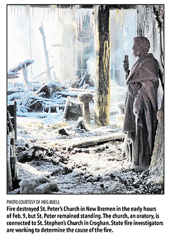 February 25, 2026 By Deacon Kevin Mastellon St. Peter’s Church in New Bremen is surrounded by graves. The parish church started burying former parishioners on the grounds soon after the Church was built in 1852. The parish was incorporated in 1869 to serve Catholics between Croghan and Lowville in Lewis County. The Church was located on Tilman Road. The nearest community is called New Bremen. It was originally known as Dayansville. Construction of St. Peter’s was finished in 1892 with the addition of a steeple. By the time Monsignor Joseph Conroy became the third Bishop of Ogdensburg. St. Peter’s was listed as a mission of the parish in Croghan. The Church is an oratory now. There was an occasional funeral Mass celebrated there. Annually in June the parishioners of St. Peter’s would join the pastor and parishioners of St. Stephen’s in Croghan to celebrate a patronal Mass at the Church dedicated to St. Peter. Until February 9, 2026. “It was two or three o’clock in the morning when someone drove by and noticed the flames coming out of the Church,” according to Father Donald Manfred, the pastor of St. Stephen’s in Croghan, the parish that includes St. Peter’s in New Bremen. The Church building was destroyed by that fire. St. Peter’s was one of the earliest constructed in what would become the Diocese of Ogdensburg. A statue of St. Peter that stood at the front of the Church was salvaged. So were a holy water font and the Church bell. “The firemen were very good about saving whatever they could,” Father Manfred said. Since the church was an oratory, the Tabernacle was empty. Hand-carved wooden statues of Mary and Joseph were lost. No cause of the fire has been determined. “We have had a number of agencies investigating from Lewis and Jefferson Counties. The New York State Department of Environmental Conservation has been on site too,” Father Manfred said. “But they do not have a cause yet.” “There was an oil tank in the basement of the building, and it had leaked. Just how much leaked out is still to be determined,” according to the pastor. “The tank has been removed, and the grounds will have to be dealt with before any additional work at the site.” The North Country Catholic asked if the fire might have been set intentionally. Father Manfred told us, “I don’t think there is anything right now to even guess what might have happened.” Reconstruction of the Church is not even a consideration according to Father Manfred. Consideration will be given to a memorial on the site, and an annual service to recall all the people who, over the years, called St. Peter’s home. Deacon Peter Woolschlager grew up about a quarter mile down the road from the church. He celebrated his sacraments of initiation in St. Peter’s. The deacon is now a well-known musician and music teacher. “I started there as an altar server but then, as I tell people, I was benched, the organ bench,” he said. “I played the organ at Mass and other liturgies until I was asked to move to St. Stephen’s when I was in high school.” Deacon Woolschlager was ordained in 2021. He is now assigned to St. Stephen’s in Croghan and St. Francis Solanus in Harrisville. One of the pictures that circulated after the fire was of the statue of St. Peter that survived the fire. The statue is in the foreground of the picture with the charred remains of the church in the rest of the scene. St. Peter is holding the keys to the kingdom in his hand, reminding us, Deacon Peter said, “of what is most important.” Father Manfred said it best, “It has been a devastating experience for people in the area. There are so many that remember family occasions, baptisms, confirmations, weddings, funerals and so many people that remember their place of worship. It is not so much a loss of a building as a loss of a place that reminds people of their faith, the beginnings of their faith. That is the sad part of this whole thing.” |