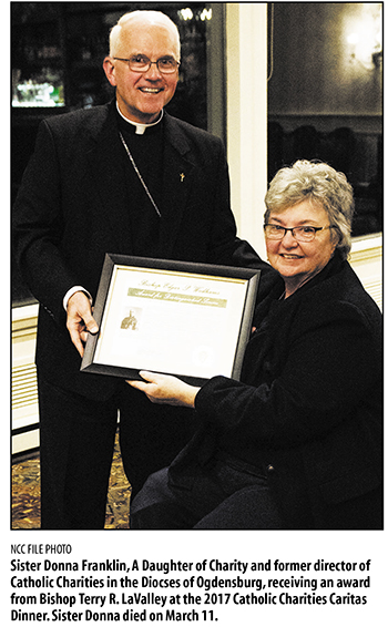March 18, 2026 By Darcy Fargo While she helped thousands of people in her 22-year tenure as director of Catholic Charities of the Diocese of Ogdensburg, Sister Donna Franklin, a Daughter of Charity, focused on each individual as a beloved child of God. Sister Donna died early in the day on Wednesday, March 11. “Looking back at her time at Catholic Charities, it was under her leadership that they started outreach to migrant farmers,” said Gayle Frank, retired diocesan Family Life director and Youth director, who worked with Sister Donna regularly for two decades. “To my knowledge, she was the first one who started working on human trafficking awareness in the North Country. Wherever there were marginalized people, she was there. During the Ice Storm (of 1998), (Sister Donna) traveled all over the diocese with Bishop Loverde going to farms and going to businesses and making sure each person had everything he or she needed. That was lifegiving for her. It really got her out into the trenches.” Sister Donna earned a bachelor’s degree in 1981 from Emmanuel College in Boston; a master’s in social work in 1988 from the Hunter College School of Social Work in New York; and a certificate in chemical dependency counseling in 1991 from Villanova University in Pennsylvania. She was licensed clinical social worker in New York State, and she used those skills regularly in her role at Catholic Charities and in the service of others. “Between youth ministry and family life ministry, it wasn’t uncommon to run into families experiencing problems – family conflict, divorce, separations and other problems,” Frank said. “If there was a problem I didn’t know how to handle, I could always go to (Sister Donna). I would regularly go to her for advice. She had all the degrees I didn’t have. I just had the sense to get qualified help. We were able to talk through a lot of the issues we’d see. And while she was always serious about her ministry, she also did it all with laughter and love.” Frank said Sister Donna strongly believed in supporting the “domestic Church.” “Her whole vision was to put family first and God will provide a way,” Frank said. “She would very, very kindly and passionately spread that to everyone she knew. In every incident that came up, to every person who came into the Catholic Charities office, she showed kindness and compassion. She was direct, and she spoke the truth without fear, but she did it with love and care.” In addition to her work with Catholic Charities, Frank noted that Sister Donna was a regular instructor in the Formation for Ministry program and in the Deacon Formation program. “(Sister Donna) worked a lot with the wives of the guys in deacon formation,” Frank said. “She’d tell us, ‘put family first. It’s your husband’s ministry, and you’re in it with him, but the sacrament comes first.’ She was wonderful! She taught us well. She listened to us – all the wives. She would bring in speakers who were real people with real issues. She wanted us all to know we could do this without being perfect first.” Frank said Sister Donna was also a personal friend and helped her deal with her own family situations. “We had lots of issues with our own kids,” Frank said. “Our son was a drug addict. (One son) had two divorces. (Another son) had one divorce. And I was the Family Life director. She was the only person I dared to tell for a while. We often discussed the fact that every family is dysfunctional, even ours. And (Sister Donna) always listened and offered love and wisdom.” Frank and Sister Donna often traveled together as they went to conduct workshops or classes. “It was always an adventure with (Sister Donna),” Frank said. “It really was. We always had a great time and laughed a lot. She was a wonderful woman of God.” Sister Donna was honored upon her retirement with the Cross Pro-Ecclesia et Pontifice (Cross for the Church and the Pontiff.) The award, conferred for distinguished service to the church, is the highest medal that can be awarded to the laity by the pope. In 2011, she was honored with the New York State Catholic Conference Council of Catholic Charities Directors’ annual Bishop Mugavero Award. The award recognizes individuals in New York State who have made significant contributions in charity and social justice. Before she was assigned to the Diocese of Ogdensburg, Sister Donna worked as a parish social worker in Philadelphia, a caseworkersocial work supervisor for Child Day Treatment Center, Bronx; and a director of group homes for children in Albany and in Boston among other social work positions in Philadelphia, New York and Kentucky. A complete obituary was not available at NCC press time and will appear in a future edition.